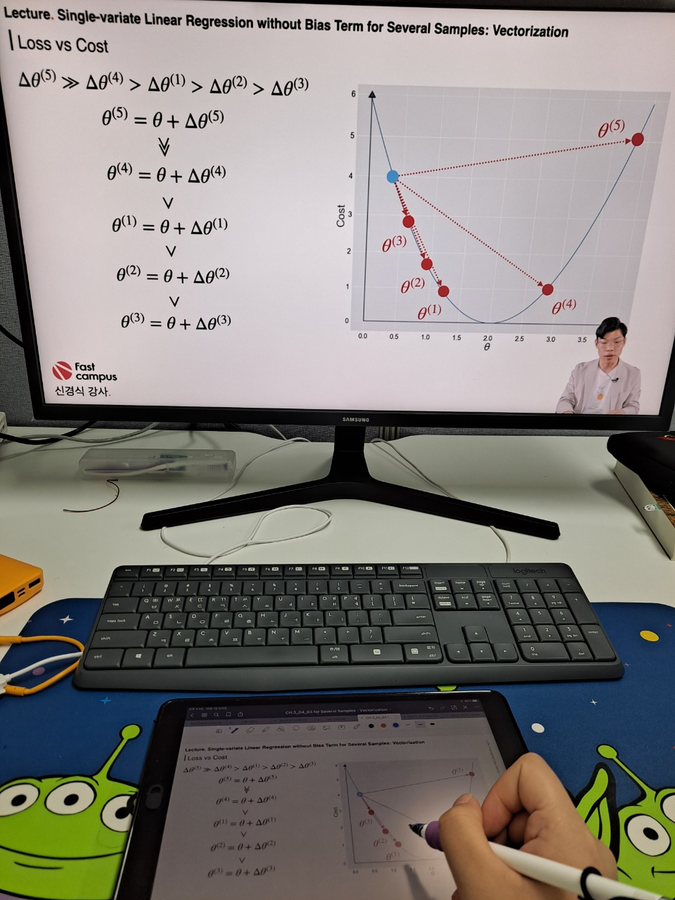 저번 시간에도 여러 개의 샘플에 대한 학습 방법을 배웠는데, 저번 시간까지는 2개의 샘플에 대한 학습 방법이랄까. 되게 간단하게 배웠었다. 이번 강의에서는 정말 여러개 n개까지 확장해서 학습하는 방법을 배웠다. 학습을 하는데 세타도 최적화 시키고, loss, cost, gradient 등을 각각 구하는 방법이 모두 다른데 그것들 하나하나 설명해주셨다.