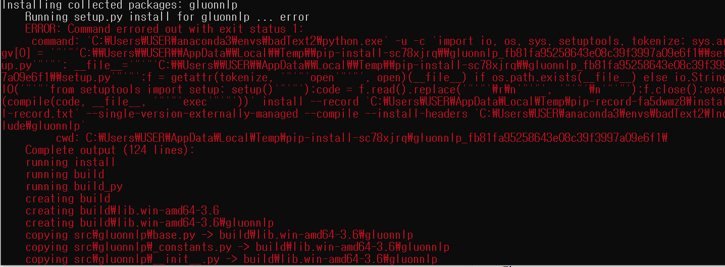 anaconda prompt에서 gluonnlp를 설치하는 과정에서 오류 발생 pip install gluonnlp 명령어를 통해 설치를...