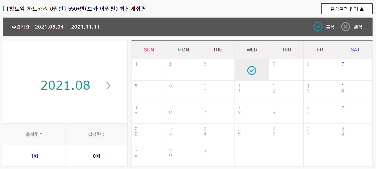 환급반에 입장하면 이렇게 달력이 있다. 출석체크를 관리할 수 있어 편리하다.