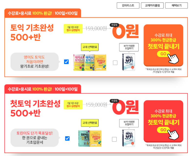 나는 해커스의 환급 조건이 좀 더 달성하기 쉬울 것 같아서 해커스 토익으로 신청했다.