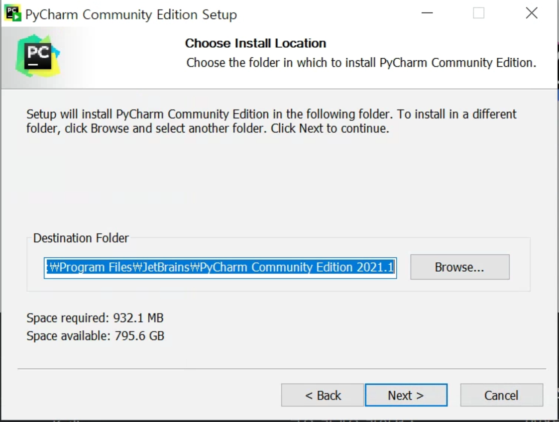 Browse 를 클릭해서 파이참이 설치되길 원하는 경로를 바꿔주어도 좋다.