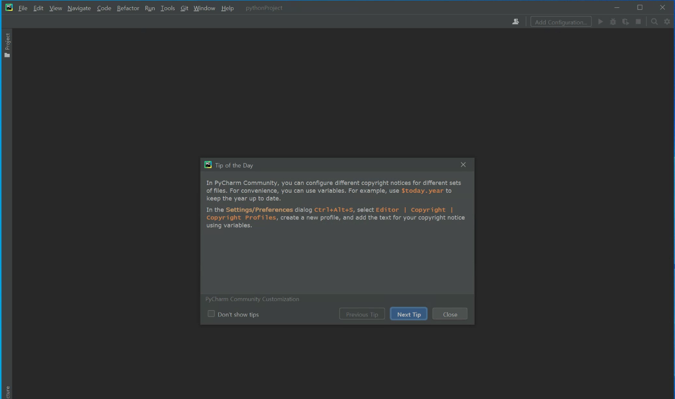 파이썬 프로젝트 화면이 뜨고, Tip 이 나온다. 파이참 사용에 대한 팁을 매일 알려주는데 왼쪽 아래 Don't show tips 체크박스를 체크하고 창을 닫으면 다음부터는 창이 뜨지 않는다.